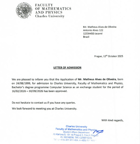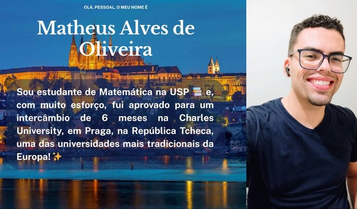 Um estudante de matemática da USP, de origem muito humilde, recebeu uma bolsa acadêmica para estudar durante 6 meses na Charles University, na República Tcheca, uma das mais antigas e renomadas da Europa.