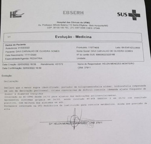 Além de toda dificuldade em seu quadro, todas as internações e intervenções médicas, no ano passado, infelizmente, o Davi testou positivo para o COVID-19, e com isso teve uma sequela, e hoje em dia ele não se alimenta pela boca, utilizamos um dispositivo na barriga chamado gastrostomia para as refeições líquidas, apenas.