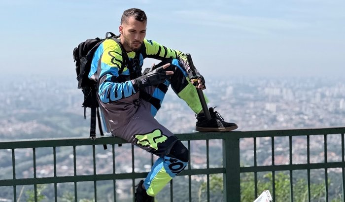 uma câmera Insta360, baterias de drone, uma caixa JBL, equipamentos de proteção e outros acessórios que ele usava no dia a dia.