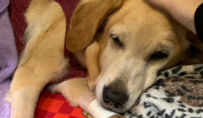 Essa cachorrinha da foto é a Mel. Ela é uma mistura de labrador com golden e precisa da sua ajuda.