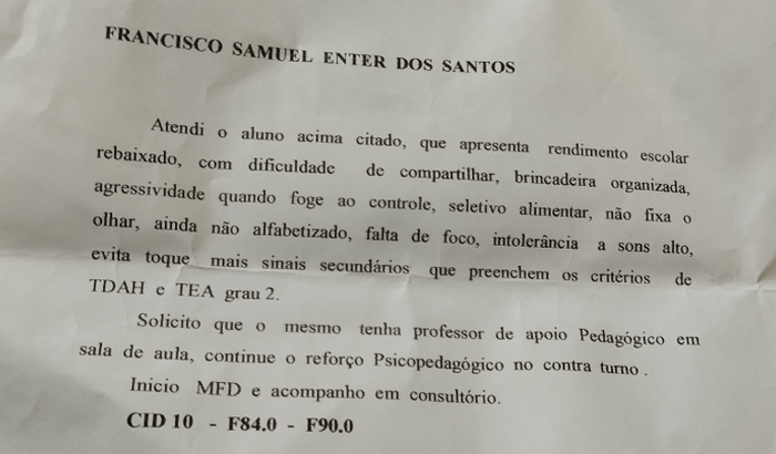 Então por meios próprios e encaminhamento da escola levamos ele em uma consulta com uma neuropediatra e foi diagnosticado com
