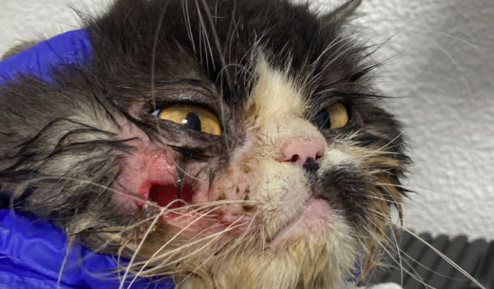 Encontramos um gato dentro do pátio da loja hoje cedo. Ele entrou para se esconder e se proteger. Estava muito assustado!Apresentava ferida aberta na face, maxilar quebrado, muito magro, desnutrido, desidratado e com dificuldade para andar.