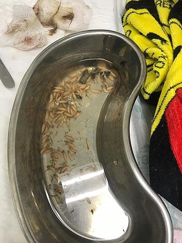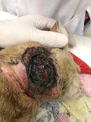 Esse gato foi resgatado com uma ferida imensa no pescoço, estava sendo comido vivo por larvas.