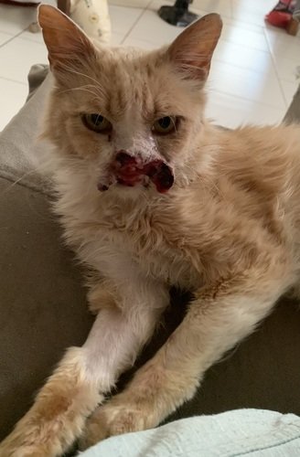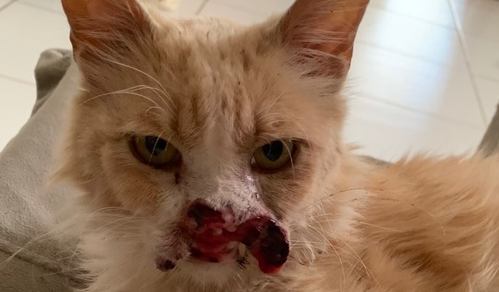 O diagnóstico:Leôncio possui CCE (Carcinoma de Células Escamosas), um tipo de câncer de pele geralmente causado pela exposição prolongada ao sol. A doença já destruiu grande parte de seus lábios superiores e parte do nariz, causando-lhe muito sofrimento. Apesar de toda a dor que sente, é um doce e adora pedir carinho! A esperança do Leôncio está na eletroquimioterapia, o tratamento mais eficaz para esse tipo de tumor. Com esse procedimento, é possível regredir o câncer e devolver a qualidade de vida que ele tanto merece.Como você pode ajudar: