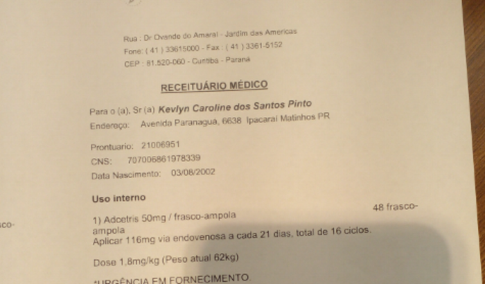 Ola pessoal! Me chamo Keli e sou mae da Kevlyn. Ela tem 21 anos, cursa o 4°ano de Biologia e esta à 3 anos em tratamento contra um câncer linfatico chamado Linfoma de hodgkin. Ela ja passou por 27 quimioterapias e 1 transplante de medula. Agora no momento esta fazendo a chamada imunoterapia, que custa em media 60 mil cada dose. Entramos na justiça para conseguir as 16 doses que ela necessita, eles forneceram apenas 2 e suspenderam o fornecimento. Entramos com recurso, porem ainda não foi julgado. Ela precisa tomar a terceira dose em 8 dias e por isso estou aqui fazendo essa vaquinha. Não podemos esperar e precisamos comprar essa dose para não interromper o tratamento que agora passara a ser aliado à uma quimioterapia. Conto com a solidariedade de todos para isso. Deus abençoe cada um que puder ajudar.