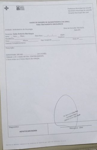 Os médicos passaram pra nós que por enquanto não podem operar, devido a veia porta estar envolvida pelo câncer e até não diminuir o tamanho ele também não poderá fazer quimioterapia venosa por enquanto.O tratamento indicado é uma químio via oral que custa entre R$ 7.000,00 a R$ 10.000,00 a caixa com 60 comprimidos! Ele precisa tomar 4 x dia. Na secretaria da saúde negaram o medicamento, restando agora entrarmos na justiça pra podermos ganhar pelo SUS.