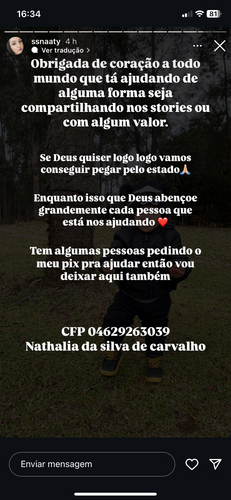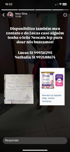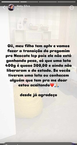 Boa tarde! Meu afilhado, Miguel, de 1 ano e 5 meses precisa realizar a troca do leite que ele utiliza devido a APLV. Infelizmente está em falta no estado, é uma lata custa de R$ 250 a 300 reais. Ele deve fazer o uso 5 vezes ao dia. Se alguém puder contribuir com qualquer valor, ficaremos gratos! Meu irmão se chama Lucas Tups e a esposa é Nathalia.