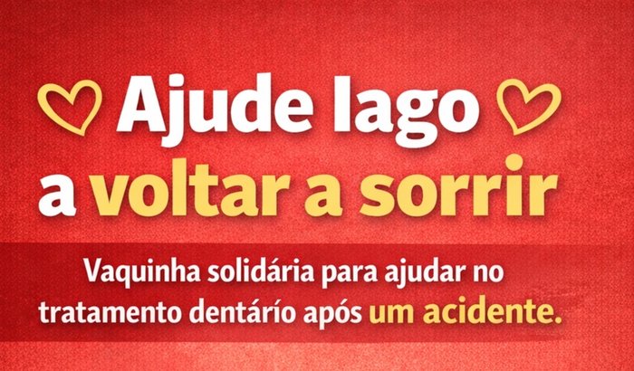 Estamos fazendo uma vaquinha para ajudar o Iago que sofreu um acidente de motorizada e quebrou a mandíbula e os dentes da frente. Quem puder ajudar com qualquer valor já faz muita diferença. ver tudo