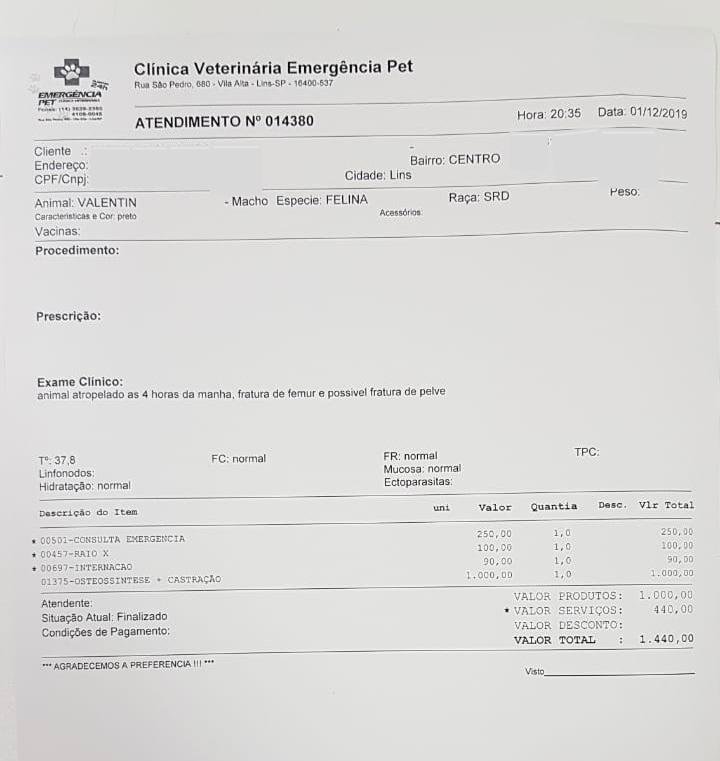 "Olá, Pessoal! Alguns de vocês já me viram pelas redes sociais e alguns já até se disponibilizaram em ajudar, mas eu fui atropelado, atendido de forma emergencial e passei por uma cirurgia bem complicadinha! Fraturei o quadril e quebrei meu fêmur! Mas fui muito forte, bonzinho e valente, além de ser um gatinho muito lindo e especial! Tudo isso custou até o momento R$ 1.440,00, fora medicamentos e outros gastos que poderei ter depois. Estou feliz e agradecido por ter sido socorrido pela minha nova Mamãezinha Lilian, mas contamos com a ajuda de todos que se comoveram com a nossa situação... desde que minha Mamãezinha tem dedicado todo o amor do mundo pra mim, mas não tem condições de pagar essa conta sozinha! Vocês poderiam nos ajudar, por favor? Pode ser com R$ 10 ou a quantia que puderem! Nós agradecemos muito e desejamos de coração que Deus abençoe a todos! Com muita gratidão, Valentin.”