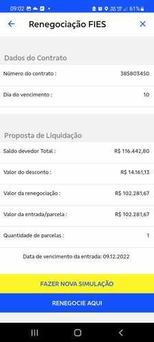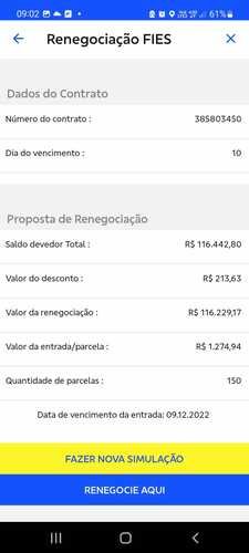 O meu contrato inicial era de menos de R$ 104.000,00 e com a renegociação oferecida ou eu pago R$ 102,281,67 a vista ou R$ 191,241,00 dividido de 150 parcelas de R$ 1.274,94 o que infelizmente não tenho a menor condição de pagar.