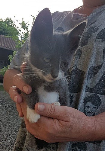 Esse gatinho foi abandonado em frente a minha casa. Estava sujo e machucado, com a barriga inchada e uma pata a princípio machucada, e o olho direito aparentemente irritado.
