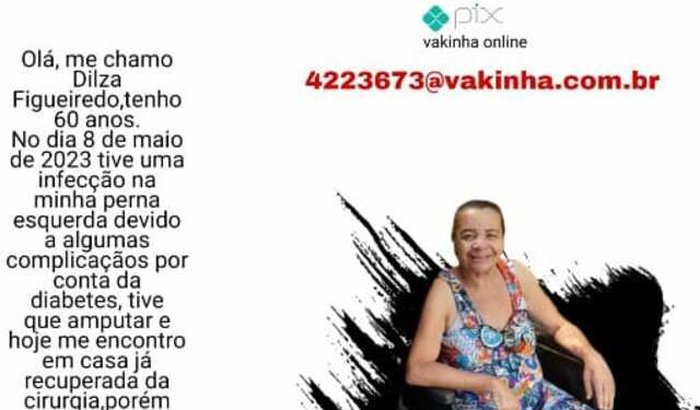 Olá, me chamo Dilza Figueiredo,tenho 60 anos. No dia 8 de maio de 2023 tive uma infecção na minha perna esquerda devido a algumas complicaçãos por conta da diabetes, tive que amputar e hoje me encontro em casa já recuperada da cirurgia,porém não tenho condições de seguir com o tratamento. Preciso de ajuda para comprar uma prótese para seguir com as fisioterapias e voltar a andar de novo!