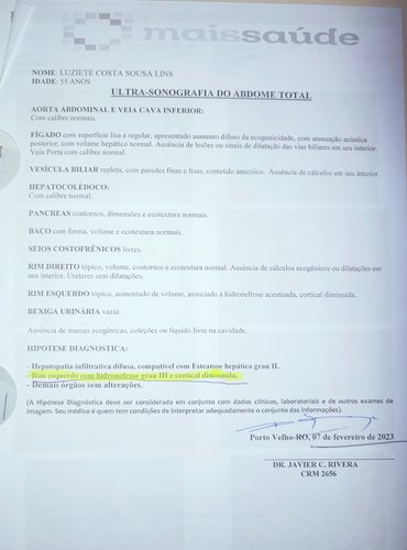Foi aí que o médico viu algumas irregularidades e pediu alguns exames mais específicos. Infelizmente, o diagnóstico foi que um dos rins dela estava funcionando apenas 9% enquanto o outro 91%.