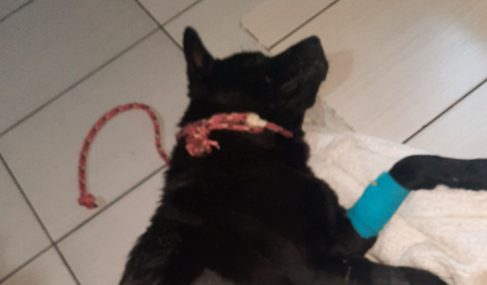 Graças a Deus foi socorrido por uma alma caridosa e hoje está internado em uma clínica. Apesar de socorrido, Preto continua sem lar e a pessoa que o ajudou não tem condições de arcar com os gastos veterinários.