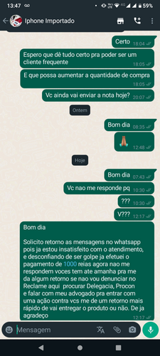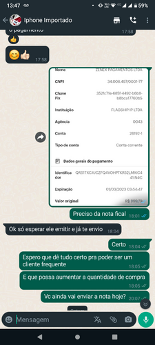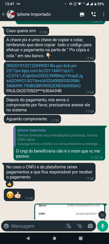 Meu nome é Joao Vitor sou de timon no Maranhão Realizei uma compra online em uma loja do intagram @_iphoneimportado no dia 28/02/2023 com endereço em Cameta-PA quando fui direcionado para o whatssap eu pedi o cnpj e me passarem esses 39.783.419/0001-00 nome R R LIMA COMERCIO VAREJISTA DE CELULARES LTDA nome fantazia IPHONE BELEM, eu passei todos o meu dados e endereço para envio cpf tudo em seguida realizei o pix de R$ 1000,00 para a o destinatário da ZENEX PAGAMENTOS CNPJ 34.006.497/001-77 questionei sobre isso pra ele mais falou que estava correto, ate o hoje dia 02/03/2023 eu não obtive mais respostas ja entrei em contato com outro numero ele responder mais quando me identifico nao respondem mais o numero no whatsapp dele é (62) 8667-0357 estou anexando os print como prova era um sonho da minha namorada ter um celular juntei dinheiro por meses pra poder da pra ele de presente e vem um golpista e me roubar.