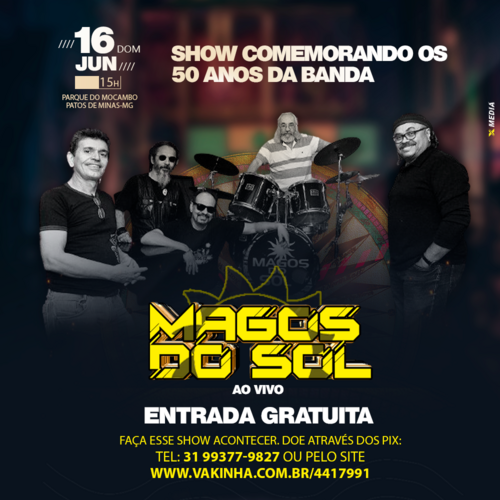 Vamos realizar esse Show com entrada franca no Parque do Mocambo em Patos de Minas no dia 16 de junho de 2024 às 15 horas.
