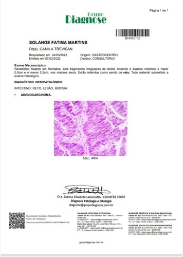 Solange Fátima Martins tenho 43 anos tive câncer de intestino diagnosticado em 2020 fiz cirurgia e quimioterapia e em fevereiro deste ano fui diagnóstica novamente com câncer já estou em tratamento desta vez o caminho vai ser mais longo começando com quimioterapia ,após radioterapia com quimioterapia oral, depois cirurgia e depois quimioterapia novamente.