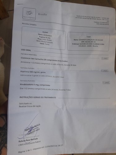 Venho através dessa vakinha online pedir ajuda no tratamento do meu gato Bernardo, que apresentou problemas renais. Levei ele no hospital veterinário público da minha cidade, consultamos e nos passaram a medicação Cistimicin e um exame de ultrassom (infelizmente o hospital não tinha esse medicamento pra fornecer e nem realizava esse tipo de exame no momento). O Cistimicin está na faixa de 100 reais e o ultrassom consigo fazer por 90 reais numa clínica recomendada pela própria veterinária que o atendeu no hospital vet público. Então, o valor que ele precisaria para iniciar o tratamento seria 190 reais. Atualmente me encontro desempregada, sempre indo em busca de um trabalho, mas está difícil encontrar. Vivo com um valor muito baixo do qual tiro nosso sustento, recebo cesta básica e ajudas de amigos para conseguir assegurar o básico, então, por mais simples que seja o valor, no momento eu não consigo custear o tratamento dele por conta própria. Se puderem me ajudar, seja doando ou compartilhando, eu ficaria muito muito grata :')Por favor, compartilhem pra alcançar mais pessoas e que Deus lhes pague 🙏 EDIT: CONSEGUIMOS! A todos que ajudaram seja doando ou compartilhando: meu muito obrigada! Bernardo conseguiu fazer os exames de graça com vets amigos e os resultados mostraram que ele estava com um pequeno cálculo na bexiga e inflamação, e que ele precisava de mais um medicamento. Ambos foram comprados e ele já está sendo medicado. 💕 Gratidão a todos! 🐱🐾❤ Fotos dos comprovantes e medicamentos estão anexados abaixo!