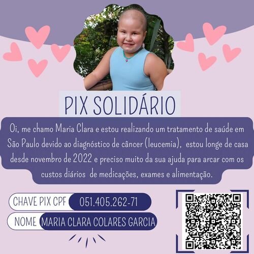 Oi, me chamo Maria Clara e estou realizando um tratamento de saúde em São Paulo devido ao diagnóstico de câncer (leucemia), estou longe de casa desde de novembro de 2022 e preciso muito da sua ajuda para arcar com os custos diários de medicações, exames e alimentação.
