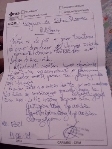 Já passei por vários psiquiatras, psicólogos, até recentemente eu estava internado. Lá na clínica em um momento de lazer deitei na cama, me tampei com a coberta peguei um fio dental enrolei varias vezes no pescoço fiquei um tempo assim, veio uma pressão absurda na minha cabeça quase apaguei, mais não consegui finalizar esse ato, ninguém ficou sabendo essa pode contar que foi a última vez que tentei suicídio faz uns 2 meses por aí.