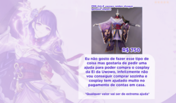 Assim como escrito na imagem, eu estou fazendo essa vaquinha para poder comprar o cosplay da Baal (Ei) Genshin impact pq o cosplay tem me ajudado a pagar as contas em casa e infelizmente eu não vou ter condições para poder comprar o cosplay.Qualquer valor vai ser bem vindo e vou ficar eternamente agradecida pela ajuda!