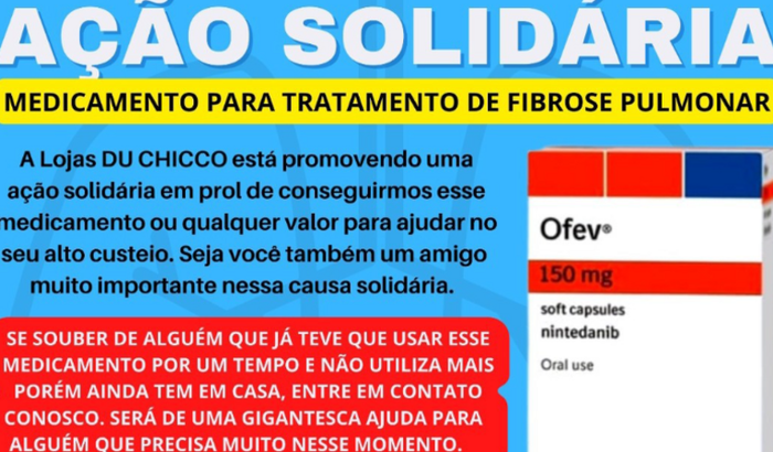 Me chamo João da Nino Comunicação Visual estou fazendo essa vakinha pra ajudar a Mãe de um amigo meu que está precisando tomar um medicamento com o nome Ofev. Sendo cada caixa de 60 cápsulas no valor de R$ 25,000,00 cada, quem puder ajudar com qualquer valor será muito gratificante, pq já tentaram pelo município, pelo estado e federal e não conseguiram o medicamento. Conto com a ajuda de vcs. Meu muito obrigado e que Deus abençoe a todos que puder ajudar .