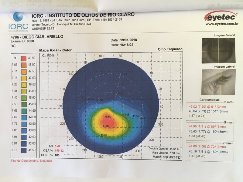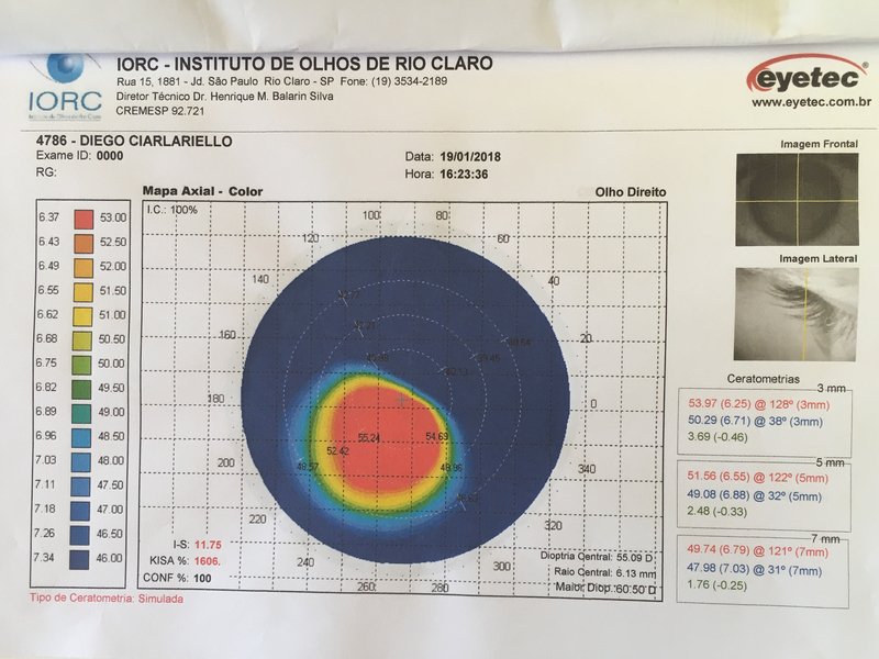 ceratocone em estado avançado no olho direito (parte vermelha, atinge mais de 50% do olho)