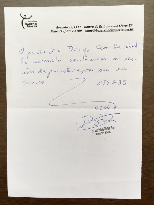Indicação do médico psiquiatra para tratamento contínuo de psicoterapia, tipo de terapia cuja finalidade é tratar os problemas psicológicos, tais como depressão, ansiedade, transtorno de estresse pós-traumático (transtorno de ansiedade que se desenvolve em indivíduos após a exposição a um evento estressor traumático, como violência física ou psicológica, acidentes, etc)