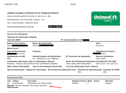 Recentemente, a Unimed Goiânia negou dois pilares essenciais para a saúde da Nicole:
