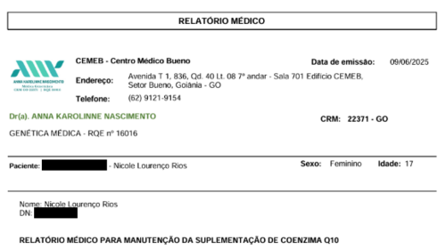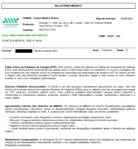 Nicole, de 17 anos, convive com a Síndrome de Disfunções Mitocondriais Múltiplas 3 (MMDS3), ligada ao gene IBA57, além da Síndrome de Ehlers-Danlos hipermóvel. Seu tratamento exige uma equipe multidisciplinar em Brasília e cuidados diários muito específicos: uma dieta cetogênica rigorosa e suplementação constante de Coenzima Q10.