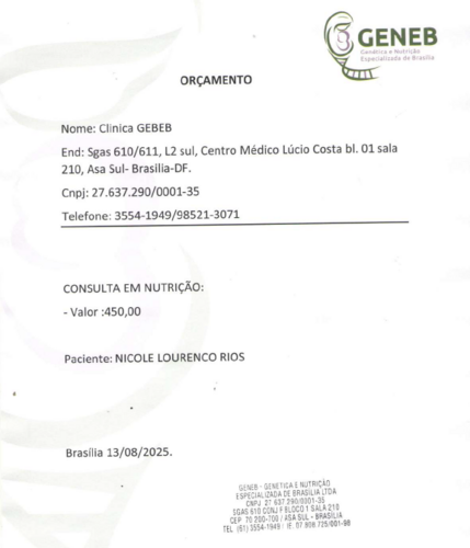 Consultas mensais com a nutricionista e demais médicas em Brasília.