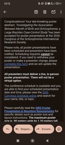 A Conquista: Meu projeto de iniciação científica "Investigating the Association Between Month of Birth and Schizophrenia: a Large Brazilian Case-Control Study", foi aceito para apresentação no Congress of the Schizophrenia International Research Society (SIRS) de 2026.Este é um dos congressos de maior prestígio mundial na área da psiquiatria. Ter um trabalho aceito como late-breaking (uma categoria de destaque para pesquisas de grande relevância e atualidade) é um reconhecimento do rigor técnico e da importância do que estamos desenvolvendo aqui no Brasil e uma oportunidade de trocar experiências com pessoas de outros lugares e representar a Escola Paulista de Medicina em um cenário internacional.