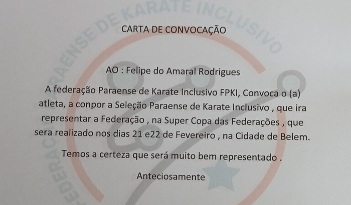 Oi, sou Felipe Rodrigues e recentemente fui convocado para compor a seleção paraense de karatê e preciso arrecadar 250,00 para participar.