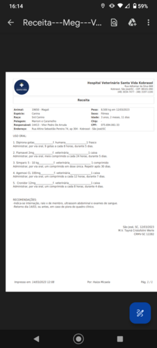 Segue também o pedido médico com os remédios utilizados. Atualmente ela está medicada e sendo muito amada por nós e por toda equipe e amigos que ajudaram e ajudam.