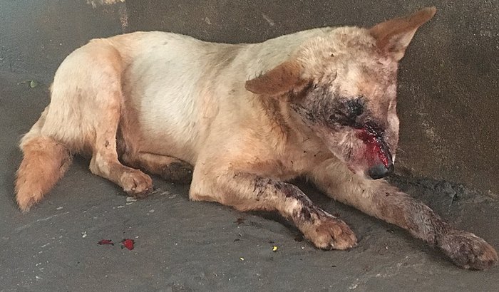 esse cachorrinho de rua está com um ferimento na região da cabeça, onde está sangrando e com bicho ele agonizada de dor, quem tiver o coração bom e poder ajudar que Deus abençoe