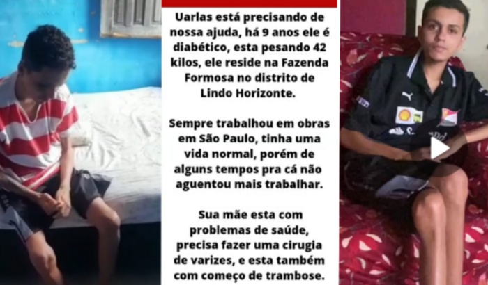 Uarlas está precisando de nossa ajuda, há 9 anos ele é diabético, esta pesando 42 kilos, ele reside na Fazenda Formosa no distrito de Lindo Horizonte.