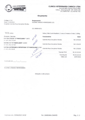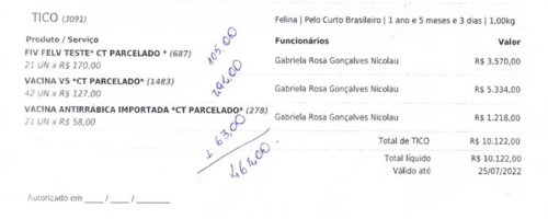 Abaixo, terão as fotos do orçamento, custo da internação e dos meus gatinhos também.