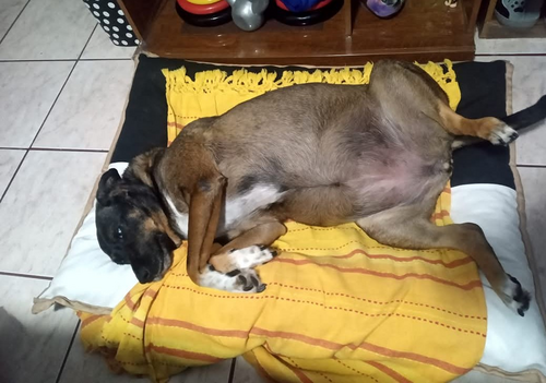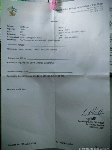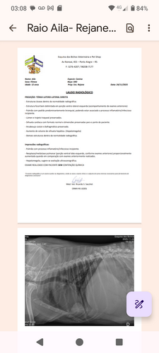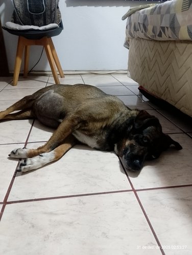 Tenho uma fiel escudeira chamada Aila , ela tem 13 anos, foi encontrada com seus maninhos num dia de chuva e desde que a vi, me apaixonei por seus lindos olhos azuis, era tão pequenina, não sabia que porte seria, eis que cresceu e ficou enorme, linda, gorda, castrada e feliz, porém em 2023 ela começou a apresentar falta de ar e foi diagnosticada com um tumor no pulmão, em 2024 começou a beber muita água e ficar com a barriga super inchada e infelizmente foi diagnosticada com 3 tumores no fígado, no início de 2025 iniciou um processo de dificuldade para caminhar e então mais um diagnóstico de Osteoartrose na coluna vertebral.