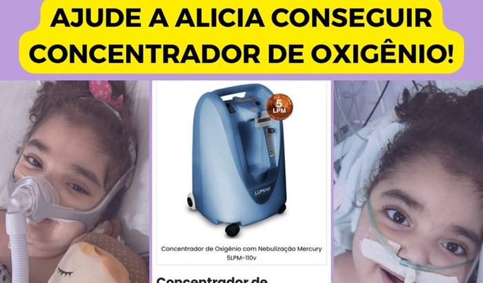 Olá pessoal, venho mais uma vez pedir essa ajuda para conseguir o concentrador de oxigênio para Alicia, pois não pensava que até o oxigênio seria tão burocrático de conseguir pelo sus, alicia tem INSUFICIÊNCIA RESPIRATÓRIA CRÔNICA e necessita de suporte