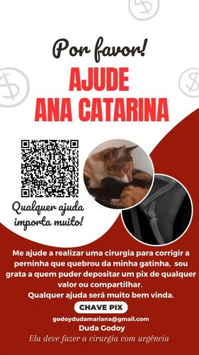 Eu sou a Eduarda, eu preciso dessa vaquinha por que minha gatinha quebro a perna, a cirurgia deve ser feita com urgência, mas custa 2.700 e eu não tenho condições para pagar essa cirurgia.. A minha gantinha Ana Catarina, tem 10 meses e bateram nela na rua fazendo com que a perninha dela quebrasse…