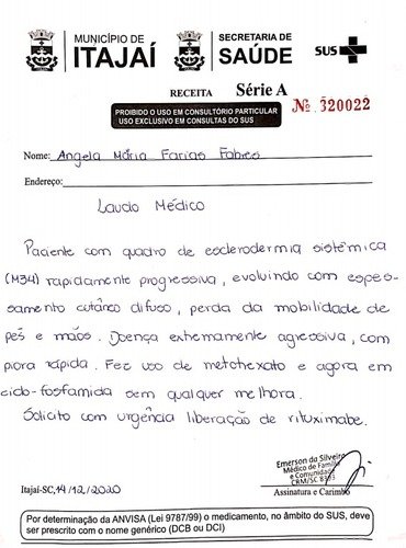 A mãe fez quimioterapia com a ciclofosfamida, mas não teve o resultado esperado. Minha mãe tem bastante dificuldade em usar as mãos, onde foi mais afetado pela esclerodermia, já apresenta dificuldade para se alimentar e teme que a doença venha a se apresentar na sua complicação mais grave, atingindo os pulmões.