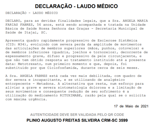 O próximo passo seria iniciar com urgência o tratamento com o medicamento Rituximab, o problema que esse medicamento é muito caro e não é fornecido pela rede pública sem abertura de processo.