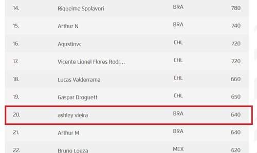 A Ashley esta classificada em 20º lugar na america latina, sendo a melhor menina do Brasil no ranking da america latina