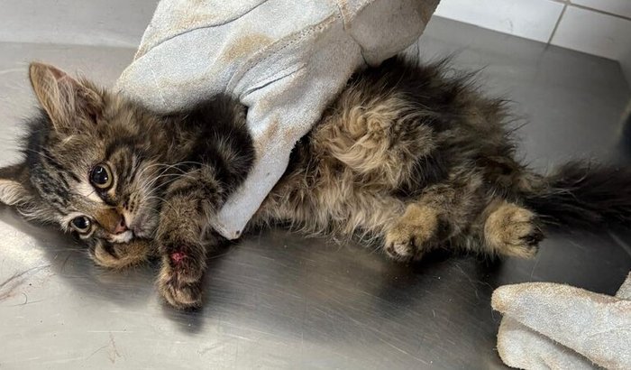 A pequena Aurora é uma gatinha de apenas 3 meses que foi encontrada abandonada em um estacionamento de caminhões, em uma situação desesperadora.