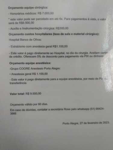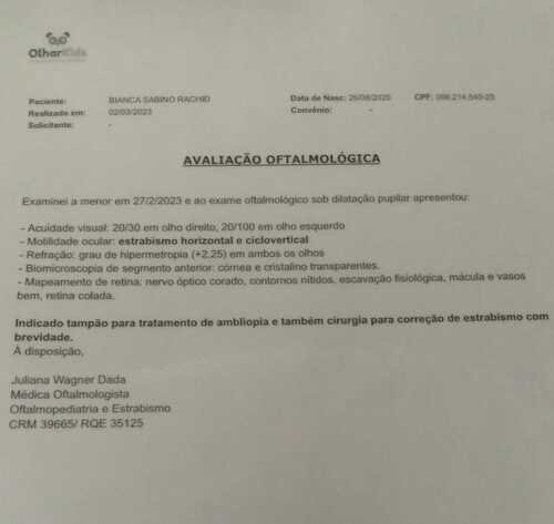Eu sou o Marco, pai da Bianca, a Bianca precisa fazer uma cirurgia oftalmológica por causa do estrabismo, que está afetando a visão dela, fizemos todas as consultas e tratamentos anteriores particulares, pois não conseguimos assistência do SUS, em Caxias não tinha oftalmologistas especializados no caso dela, agora estamos precisando de ajuda pois temos que fazer a cirurgia até o mês de junho, após isso a médica entra em licença sem previsão de retorno, e como está afetando a visão dela, não podemos esperar, obrigado a todos que conseguirem ajudar, deixamos junto o laudo sobre o caso dela, e com o valor da cirurgia, isso fora os gastos com transporte para Porto Alegre, hospedagem, pois precisamos passar novamente com a médica no dia posterior, e também tem mais custos com o site da vaquinha.