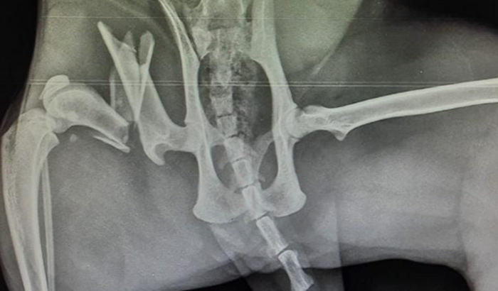 A Bolinha provavelmente sofreu um trauma muito grande, pois teve o fêmur quebrado em 3 partes e precisa fazer uma cirurgia de urgência para poder voltar a andar.