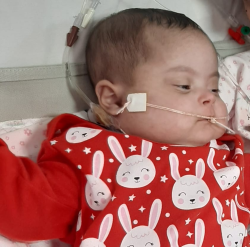 Cecília é uma bebê gemelar, prematura, nasceu em Fevereiro de 2023, com Síndrome de Down, cardiopatia congênita, insuficiência respiratória e APLV.