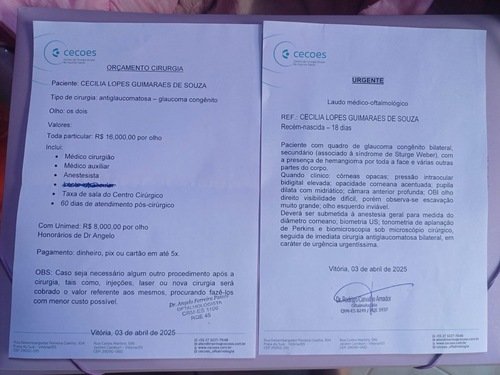 Oi pessoal, estou aqui em nome da Cecília.Cecilia nasceu dia 16/03/25 e foi diagnosticada recentemente com glaucoma congênito, uma condição rara que pode levar à cegueira se não for tratada a tempo. A cirurgia para tratar o glaucoma é essen ver tudo