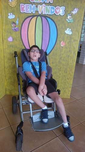 Como o Felipinho não tem controle de tronco e pescoço, ele precisa de 1 CADEIRA DE RODAS especial maior (a que ele usa já era de segunda mão e pequena) e 1 CADEIRA DE BANHO, que também seja inclinada, com cinto, para ter mais segurança e que acompanhe seu crescimento.