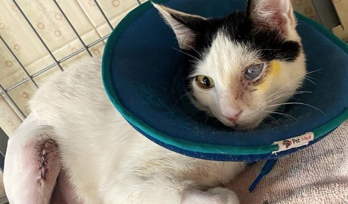 Esse é um gatinho de apenas 6 meses de idade que passou por uma situação muito triste: ele foi pisoteado por um boi e sofreu uma fratura grave no fêmur.